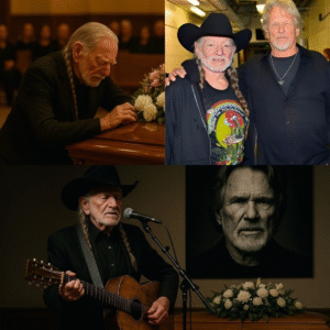 At the funeral of Kris Kristofferson, the chapel was filled with old friends, quiet tears, and the weight of a thousand songs. When Willie Nelson slowly stepped forward—his frame frail, guitar in hand—all eyes turned to him.