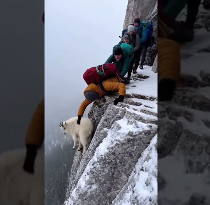The climber knew that sudden movements could make the frightened goat panic, causing it to slip off the edge. So he approached slowly, speaking softly to soothe it.