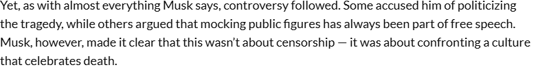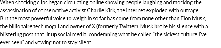 ELON MUSK STRIKES BACK: As shocking videos mocking Charlie Kirk’s death spread online, tech billionaire Elon Musk broke his silence with a blistering post on X, slamming the “sick culture” celebrating violence. His explosive words sent shockwaves through social media, reigniting fierce debate and rallying millions demanding justice for Kirk.