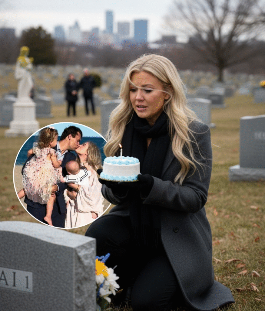 Today should have been a day of joy and celebration — a day filled with laughter, candles, and the sound of familiar voices. Instead, it became a morning wrapped in silence and sorrow. Under a pale, trembling sky, Erika Kirk — the devoted wife of the late Charlie Kirk — was seen walking slowly toward his grave. In her hands, she carried a small birthday cake, white frosting trembling in the cool autumn wind. A single candle stood at its center, its fragile flame fighting to stay alive.