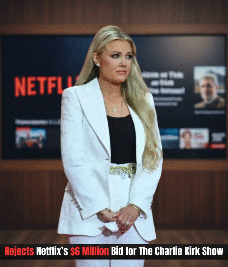 In a move that has stunned both Hollywood insiders and media executives alike, Erika Kirk has reportedly rejected a $6 million offer from Netflix to acquire or license “The Charlie Kirk Show.” The decision, described by those close to her as both “principled” and “deeply personal,” has sparked widespread admiration — and no small amount of speculation — across the entertainment world.
