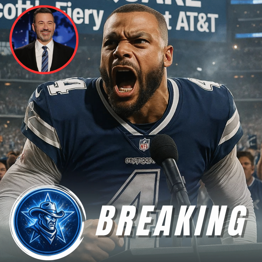 A dramatic and explosive moment rippled through the NFL and pop culture this week after a viral clip circulated showing Dallas Cowboys quarterback Dak Prescott delivering a blistering public vow aimed at late night host Jimmy Kimmel. In the clip, Prescott allegedly lashes out over recent jokes and commentary about a sensitive and tragic event, vowing in no uncertain terms that he would not tolerate what he described as turning the departed into a joke on national television. The footage — widely shared across platforms — sent Cowboys fans into a frenzy and reignited a national conversation about the limits of comedy, grief, and athlete activism.