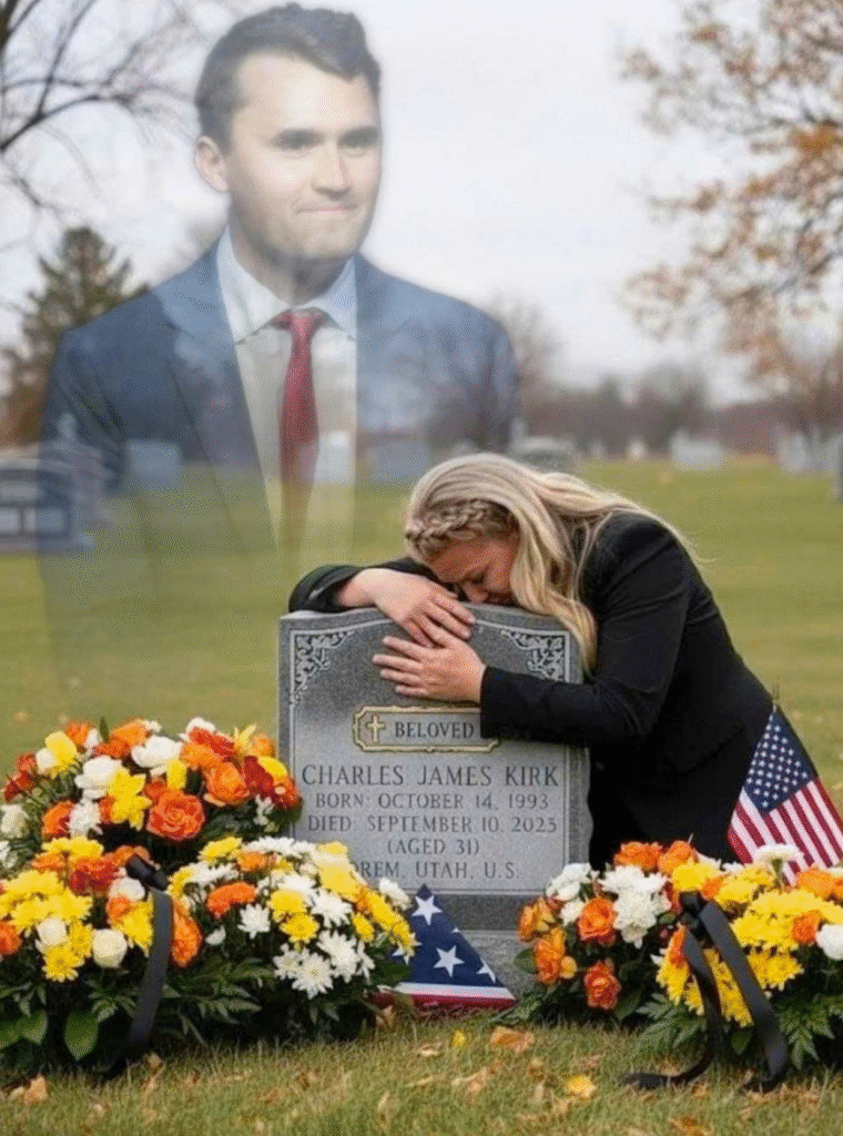 On a moonlit night heavy with wind and memory, she returned to his grave. The air was cold, the ground still damp from an earlier rain. There, before the marble carved with his name — CHARLIE KIRK — she fell to her knees, her tears cutting through the quiet like rain on stone.