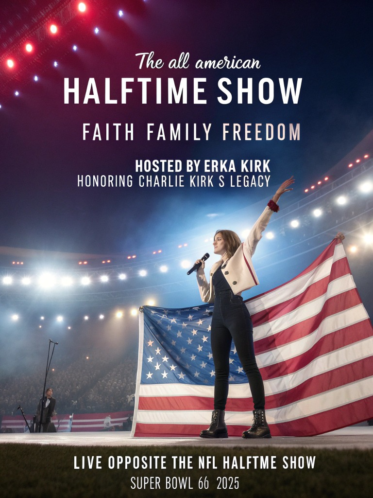 While millions of viewers tune in to the glitz and glamour of the official NFL Halftime Show, a new and profoundly patriotic event is set to make waves across America. The All-American Halftime Show — hosted by Erika Kirk — will air live opposite Super Bowl 66 in 2025, delivering a heartfelt alternative centered on the enduring American values of faith, family, and freedom.
