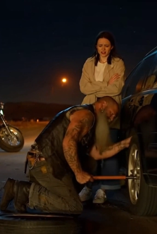 He returned to his Harley, grabbing a compact jack, tire iron, and portable air pump. Claire watched in amazement as this intimidating yet calm stranger worked with precision. Under the cold moonlight, he lifted the car, loosened the lug nuts, swapped out the ruined tire, and inflated the spare.
