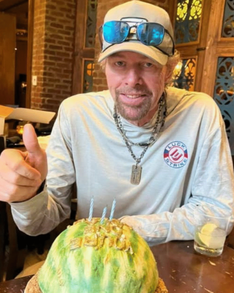“THE SMILE THAT BROKE A MILLION HEARTS.”  It wasn’t the stage lights or the roar of a crowd this time. Just Toby, sitting quietly at home — a simple table, a watermelon-shaped cake, and a glass of water beside him. He looked thinner, softer somehow, but when he lifted his hand and gave that familiar thumbs-up… it felt like the whole world stopped. That small gesture carried more strength than any song ever could. No spotlight. No grand speech. Just a man who’d given everything — still smiling, still saying without words, “I’m okay.” That’s the thing about Toby Keith. Even in silence, he could fill a room. And on that last birthday, he didn’t need a stage to remind us who he was. The cowboy spirit — unbroken, unshaken — still burned bright.